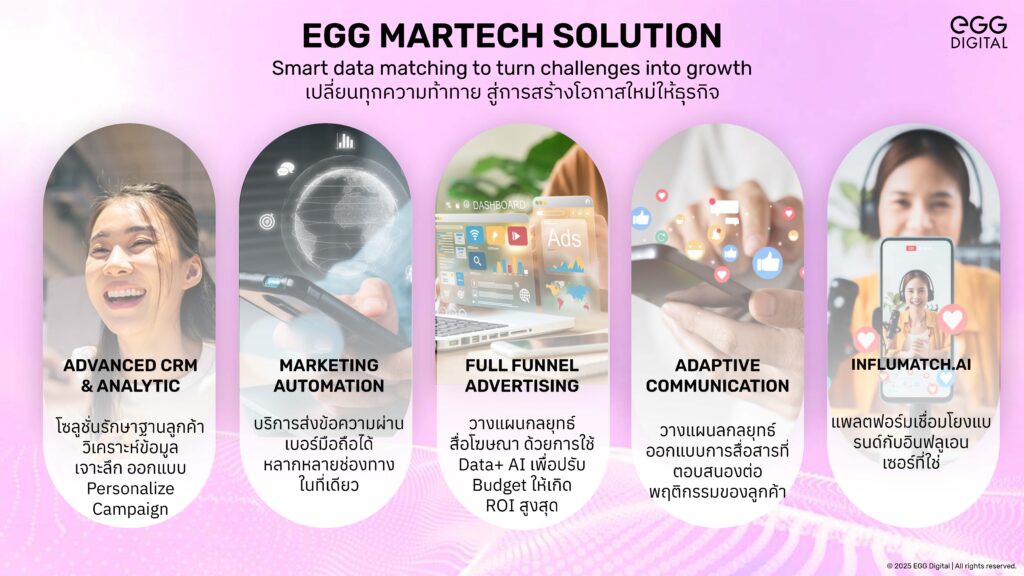 คุณรัฐธีร์ เจริญรัตน์วรกุล ผู้จัดการทั่วไป ธุรกิจ MarTech Solution บริษัท เอ้ก ดิจิทัล จำกัด กล่าวว่า “ในยุคที่การตลาดต้องขับเคลื่อนด้วยข้อมูลและเทคโนโลยีแบบเรียลไทม์ ‘MarTech’ กลายเป็นตัวช่วยและ ‘กลยุทธ์สำคัญ’ ที่นักการตลาดยุคใหม่ไม่ควรมองข้าม เอ้ก ดิจิทัล จึงผสานจุดแข็งด้าน AI และ EGG ONE Platform แพลตฟอร์มการตลาดครบวงจรที่ขับเคลื่อนด้วย EGG AI Agent พร้อมยกระดับศักยภาพการตลาดดิจิทัลให้ครอบคลุม 5 ด้าน ได้แก่ Advanced CRM & Analytic ยกระดับการทำงานแบบ Rule-based ให้คาดการณ์พฤติกรรมลูกค้าได้อัตโนมัติ พร้อมวิเคราะห์แบบเรียลไทม์, Marketing Automation เลือกช่องทางการสื่อสารที่มีประสิทธิภาพสูงสุด, Admatch.AI บริหารจัดการโฆษณาออนไลน์ได้ครอบคลุมทุกช่องทางในที่เดียว, Adaptive Communication ปรับรูปแบบการสื่อสารด้วยคอนเทนต์ที่ใช่ และ Influmatch.AI ใช้ AI จับคู่อินฟลูเอนเซอร์ ลดการคาดเดา พร้อมสร้างคอนเทนต์ UGC และ UGB ที่แม่นยำ โดยมุ่งเปลี่ยนทุกอินไซต์ให้เป็นเครื่องมือการตลาดที่ช่วยผู้ประกอบการให้เติบโตได้ในทุกสถานการณ์”