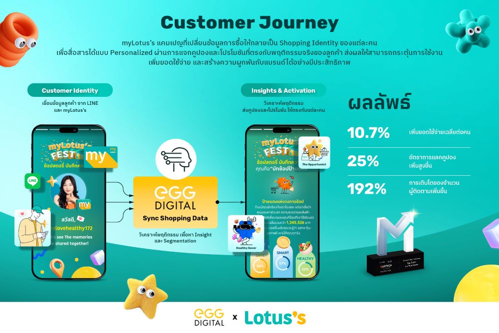 เอ้ก ดิจิทัล (EGG Digital) ผนึกความร่วมมือกับ Lotus’s เดินหน้ายกระดับระบบ CRM สู่การทำ Data-Driven Experience เต็มรูปแบบ ผ่านแคมเปญ My Lotus’s Fest 2025 ช้อปสตอรี่เปิดบันทึกความคุ้ม “My Shop Story” นำศักยภาพของ AI Analytics มาวิเคราะห์และพลิกข้อมูลธุรกรรมมหาศาลให้กลายเป็น “เรื่องราวของลูกค้าแต่ละคน” (Data Narrative) เป็นครั้งแรกในธุรกิจค้าปลีกของไทย ซึ่งช่วยให้แบรนด์เข้าใจตัวตนและพฤติกรรมของลูกค้าได้ลึกซึ้ง พร้อมต่อยอดสู่การนำเสนอคูปองส่วนลดและโปรโมชันที่ตรงใจในระดับรายบุคคล เพียงสมาชิกมายโลตัสเชื่อมต่อ Line การันตีความสำเร็จของแคมเปญ My Lotus’s Fest 2025 ช้อปสตอรี่เปิดบันทึกความคุ้ม “My Shop Story” ด้วยการคว้ารางวัลระดับ Platinum สาขา Customer Data Intelligence จากเวที MarTech Innovation Awards 2026 มาครอง ช่วยดันอัตราการเป็นสมาชิกมายโลตัสกลับมาใช้คูปองสูงถึง 25% และช่วยเพิ่มยอดใช้จ่ายต่อคน เติบโตขึ้นถึง 25%