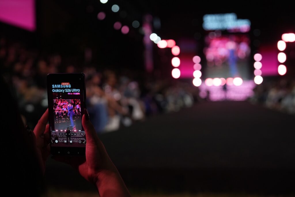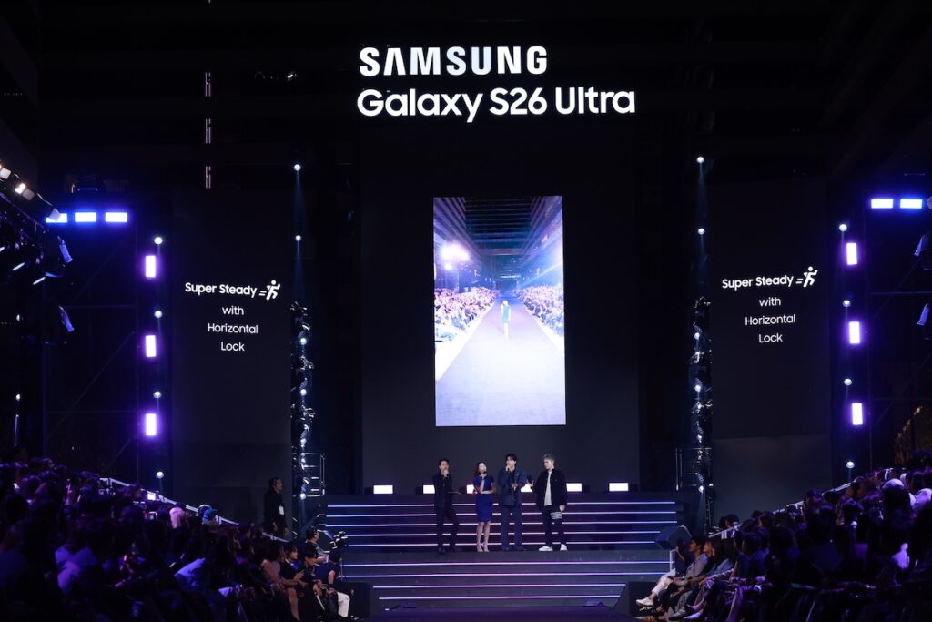 ภายในงาน “Beyond the Galaxy” ซัมซุงยังได้เนรมิตพื้นที่เป็นเวทีรันเวย์ พร้อมดีไซน์โชว์รูปแบบใหม่ ที่เน้นการนำเสนอฟีเจอร์เด่นของ Galaxy S26 Series อย่าง Nightography Runway Show ที่ขนทัพศิลปินจาก #TeamGalaxy อย่างอิ้งค์ วรันธร, นนท์ ธนนท์, เจษ – ไบเบิ้ล, เติ้ล – เฟิร์สวัน และ สกาย – นานิ ร่วมทำโชว์และเดินแบบบนรันเวย์ในบรรยากาศแสงน้อย เพื่อถ่ายทอดพลังของฟีเจอร์ Nightography การถ่ายภาพแสงน้อยก็รอด บน Galaxy S26 Ultra ที่ได้รับการอัปเกรดเลนส์ Wide และ Telephoto 5 เท่า พร้อมรูรับแสงที่กว้างขึ้น ช่วยให้รับแสงได้มากขึ้น ทำให้ภาพคมชัดแม้ในที่แสงน้อย พร้อม AI ที่ช่วยประมวลผลภาพให้สวยเป็นธรรมชาติในทุกช็อต
