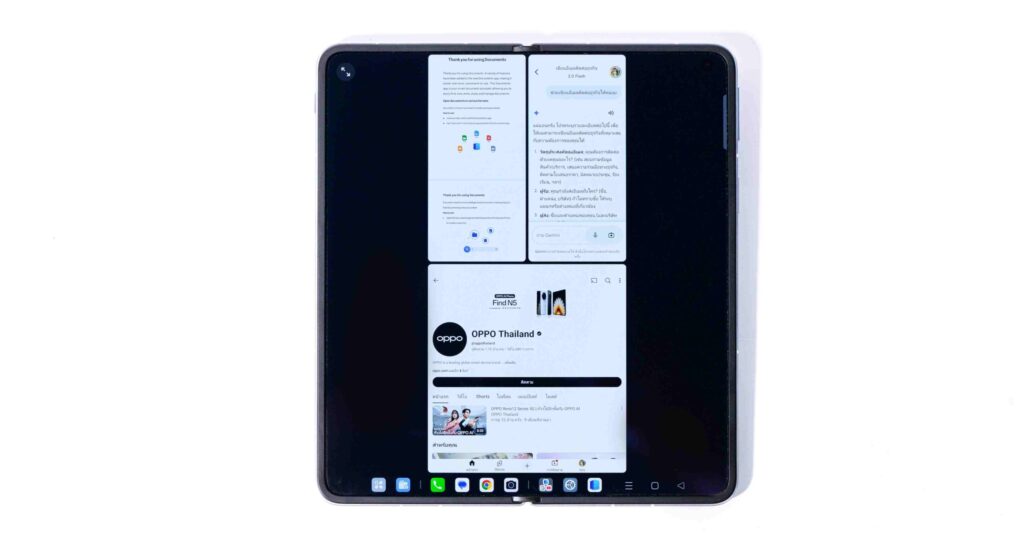 ในยุคที่การทำงานต้องการความรวดเร็วและบริหารจัดการหลายอย่างไปพร้อมๆ กัน OPPO Find N5 จึงตอบโจทย์ด้านการทำงานแบบมัลติทาสก์ที่มอบประสิทธิภาพการทำงานระดับ PC อย่างลื่นไหล มาพร้อมกับหน้าจอที่ให้มุมมองอย่างไร้ขอบเขตด้วย Boundless View สามารถเปิดแอปฯ พร้อมกันได้สูงสุด 3 แอปฯ ในเวลาเดียวกัน ไม่ว่าจะเป็นการเปิดเอกสาร ตรวจสอบอีเมล หรือทำงานกับโปรเจกต์ต่างๆ ทุกอย่างจะเกิดขึ้นบนหน้าจอเดียวอย่างไร้รอยต่อและไม่เสียเวลาในการสลับหน้าจอไปมา มาพร้อมผู้ช่วยอัจฉริยะอย่าง AI Toolbox ที่จะช่วยจัดการงานต่างๆ ได้อย่างมีประสิทธิภาพ เรียกใช้งานฟังก์ชันที่ต้องการได้ทันที ลดเวลาที่เสียไปกับการค้นหาหรือทำงานที่ซ้ำซ้อน อีกหนึ่งฟีเจอร์ที่ช่วยเพิ่มความสะดวกในการทำงานคือ AI Call Summary ซึ่งช่วยในการสรุปข้อมูลจากการโทรหรือการประชุม โดย AI จะสามารถถอดข้อความเสียงและสรุปเนื้อหาของการสนทนาได้อย่างง่ายดาย นอกจากนี้ยังสามารถเชื่อมต่อกับระบบ Mac ได้อย่างลื่นไหล และเข้าถึง แก้ไข หรือซิงก์ไฟล์จากระยะไกลได้อย่างง่ายดาย แม้ไม่ได้อยู่ที่โต๊ะทำงาน มาพร้อมกับแบตเตอรี่ขนาดใหญ่ 5600mAh ใช้งานยาวนาน และชาร์จไวด้วย 80W SUPERVOOC รวมถึงรองรับการชาร์จไร้สาย 50W AIRVOOC ผ่านการรับรองมาตรฐาน TÜV Rheinland Reliable Folding Certification สำหรับการพับและกางที่ทนทาน พร้อมมาตรฐานกันน้ำ IPX9 ที่รองรับการใช้งานในทุกสภาวะ พร้อมเป็นสมาร์ตโฟนจอพับเครื่องแรกที่มาพร้อม Snapdragon® 8 Elite ที่ทำให้ทุกการใช้งานเป็นไปอย่างราบรื่นและไร้ขีดจำกัด