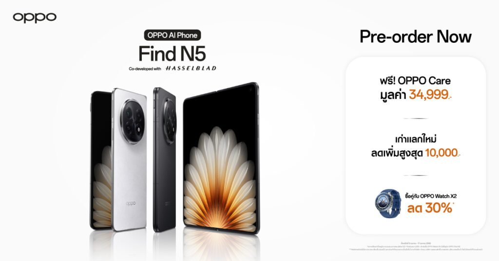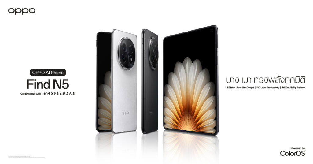 ออปโป้ ไทยแลนด์ ผู้นำตลาดสมาร์ตโฟน ยกระดับนวัตกรรมสมาร์ตโฟนจอพับด้วยการเปิดตัว “OPPO Find N5” รุ่นใหม่ล่าสุด มาในแนวคิด ‘บาง เบา ทรงพลังทุกมิติ’ ที่มาพร้อมดีไซน์บางที่สุดเพียง 8.93 มม. กับรอยพับจอที่แทบมองไม่เห็น ผสานประสิทธิภาพการทำงานระดับ PC ตอบโจทย์การทำงานแบบมัลติทาสก์ พร้อมผู้ช่วย AI อัจฉริยะ และการเชื่อมต่อระบบ Mac จากระยะไกลที่ลื่นไหล ง่ายดาย พร้อมช่วยสร้างสรรค์ภาพพอร์ตเทรตที่ดีที่สุดด้วยสุดยอดเทคโนโลยีระบบกล้อง Hasselblad Master เปิดตัวพร้อมกัน 2 สีพรีเมียม ได้แก่ สีขาว Misty White และ สีดำ Cosmic Black ในราคา 69,999 บาท เสริมทัพด้วย OPPO Watch X2 สมาร์ตวอตช์ระดับแฟลกชิปดีไซน์หรูหรา พร้อมฟีเจอร์ตรวจสุขภาพภายใน 1 นาที ในราคา 13,999 บาท สัมผัสได้แล้ววันนี้ ณ OPPO Brand Shop ทุกสาขา และตัวแทนจำหน่ายทั่วประเทศ