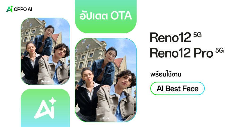 OPPO เปิดตัวการอัปเดตซอฟต์แวร์ OTA สำหรับ OPPO AI Phone อย่าง OPPO Reno12 5G และ OPPO Reno12 Pro 5G สมาร์ตโฟน AI เครื่องแรก ดีที่สุดสำหรับคนรุ่นใหม่ในราคาระดับกลาง พร้อมใช้งานฟีเจอร์ AI อย่าง AI Best Face ซ่อมรูปพังให้ปังได้ในคลิกเดียว ตั้งแต่วันที่ 2 กันยายน เป็นต้นไป