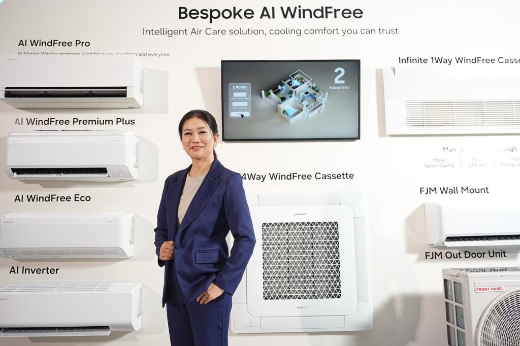 ไลน์อัปปีนี้นำโดย Bespoke AI WindFree PRO, Free Joint Multi และโซลูชันเชิงพาณิชย์ DVM AI Active ที่ออกแบบมาให้รองรับบ้านทุกขนาดและการใช้งานที่หลากหลาย โดยเฉพาะ Free Joint Multi ที่เพิ่มความยืดหยุ่นในการติดตั้งหลายโซนโดยไม่ต้องเพิ่มคอยล์ร้อน ช่วยรักษาความสวยงามของพื้นที่อยู่อาศัย พร้อมยกระดับดีไซน์ด้วยแนวคิด Grid Design และพื้นผิวแมทใหม่ที่กลมกลืนกับสภาพแวดล้อม พร้อม AI Integrated Blade Design ที่ควบคุมการไหลเวียนอากาศได้อย่างแม่นยำ รอบด้าน เพื่อมอบความเย็นสบายอย่างมีประสิทธิภาพ