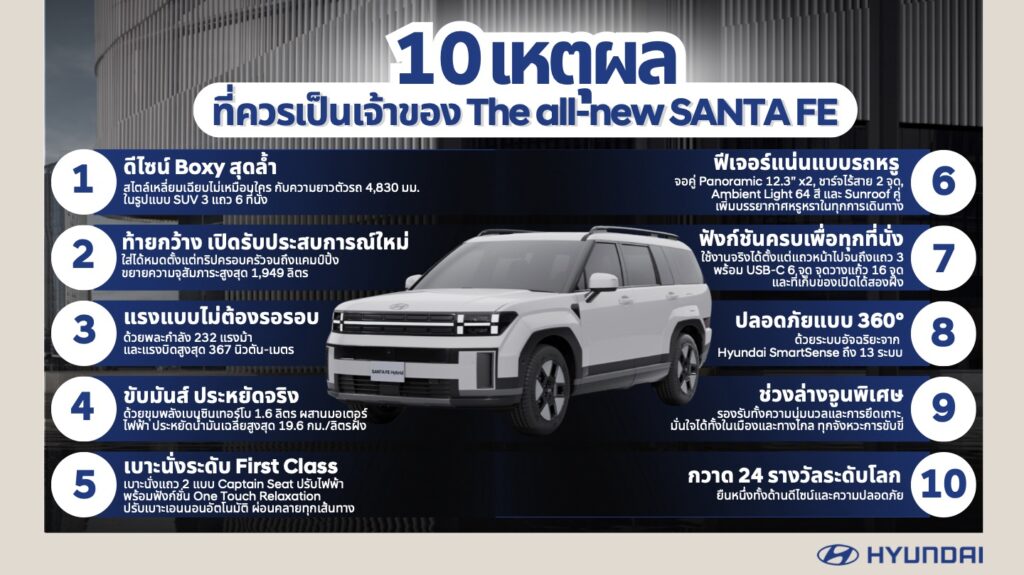 บริษัท ฮุนได โมบิลิตี้ (ประเทศไทย) จำกัด สร้างปรากฏการณ์เขย่าตลาด SUV ไทย ด้วยการส่ง The all-new SANTA FE ยนตรกรรม SUV ไฮบริดระดับเรือธง 3 แถว 6 ที่นั่ง ที่รวมทุกความต้องการไว้ในคันเดียวอย่างไร้ข้อจำกัด ไม่ว่าจะเป็นดีไซน์ทรงเหลี่ยมแบบ Boxy สุดล้ำ ภายในห้องโดยสารหรูหรา พื้นที่เก็บสัมภาระท้ายที่กว้างขวาง พร้อมขยายพื้นที่เพื่อเปิดรับประสบการณ์ใหม่ ๆ มาพร้อมฟังก์ชันล้ำสมัย ความปลอดภัยครบครัน และสมรรถนะเหนือระดับ สมรรถนะทรงพลัง เทคโนโลยีจัดเต็ม และความคุ้มค่าแบบที่ “ให้เกินราคา” พร้อมเผยอินไซต์ 10 เหตุผลเด็ด! ที่ทำให้ The all-new SANTA FE กลายเป็นตัวเลือกที่ต้องมีในลิสต์ของผู้บริโภคยุคใหม่ ตอกย้ำสโลแกน “Open for More Horizons” มากกว่าเส้นขอบฟ้า คือ คำว่าอิสระ ให้ The all-new SANTA FE เป็นส่วนหนึ่งในการเปิดประสบการณ์ใหม่ ๆ ไร้ขีดจำกัดสำหรับคุณ
